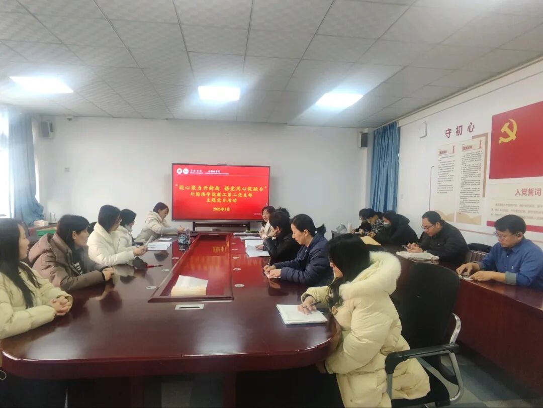 为深入学习贯彻党的二十届四中全会精神,推动党建工作与业务深度融合,1月28日下午,外国语学院教工第二党支部以“凝心聚力开新局 语心向党促融合”为主题召开主题党日活动,对标学院2026年度事业发展主要指标任务,专题研讨党支部“语党同心”品牌建设路径。