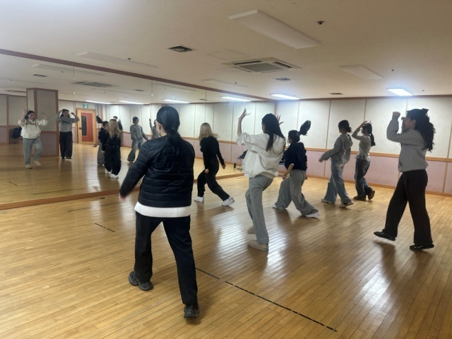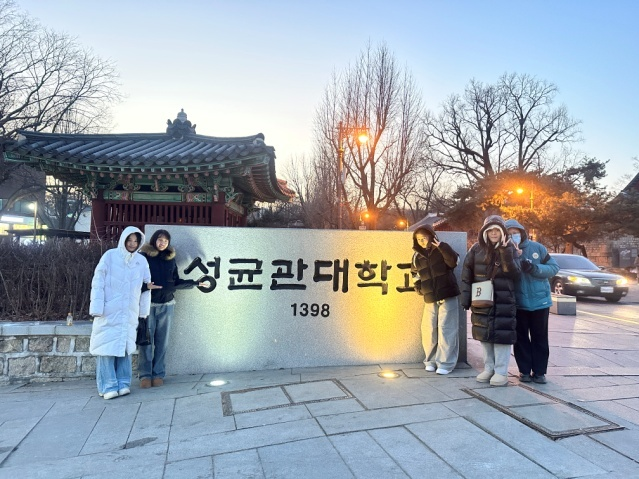 上午10点,同学们准时抵达教室,与韩语老师共度两小时的语言学习时光。下午的K-POP舞蹈体验环节同样精彩纷呈,在祥明大学舞蹈专业老师的指导下,同学们化身“K-POP舞者”,学习热门曲目舞蹈编排,在动感节奏中感受韩国流行文化的独特感染力。舞蹈体验结束后,陈晨老师带领同学们参访韩国顶尖学府——成均馆大学。此次参访为研学之旅增添了浓墨重彩的一笔,作为拥有六百余年历史的名校,成均馆大学将儒家“仁、义、礼、智”的校训与现代学术精神深度融合,校园内古典韩式建筑与现代化教学设施交相辉映,尽显“历史与现代共生”的独特气质。