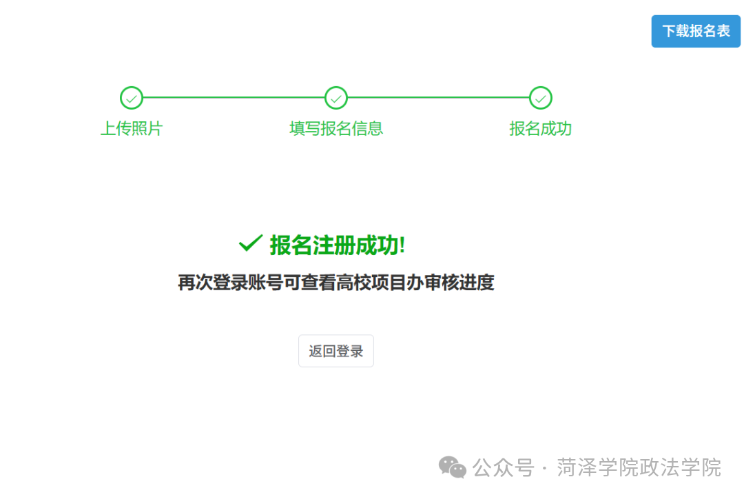 ◆ 显示“报名注册成功”后,点击右上角的“下载报名表”,进行下载并打印。