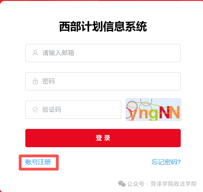 ◆ 进入“西部计划信息系统”页面,点击左下角“账号注册”进入申请注册链接页面。