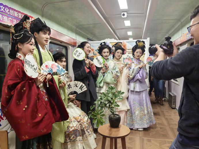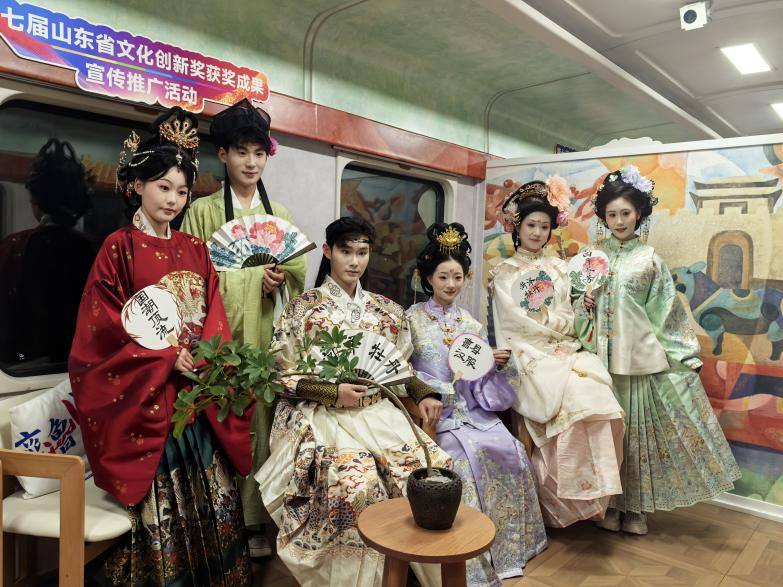 3月21日晚,第七届山东省文化创新奖获奖成果宣传推广系列活动——“曹县汉服 国潮顶流”“菏泽牡丹 四月芬芳”主题宣传活动在齐鲁1号旅游专列温情启幕。菏泽学院外国语学院志愿者身着明制汉服与宋代圆领袍,以青春力量助力曹县汉服文化与菏泽牡丹文化向全国游客传递,展现校地文旅融合新活力。