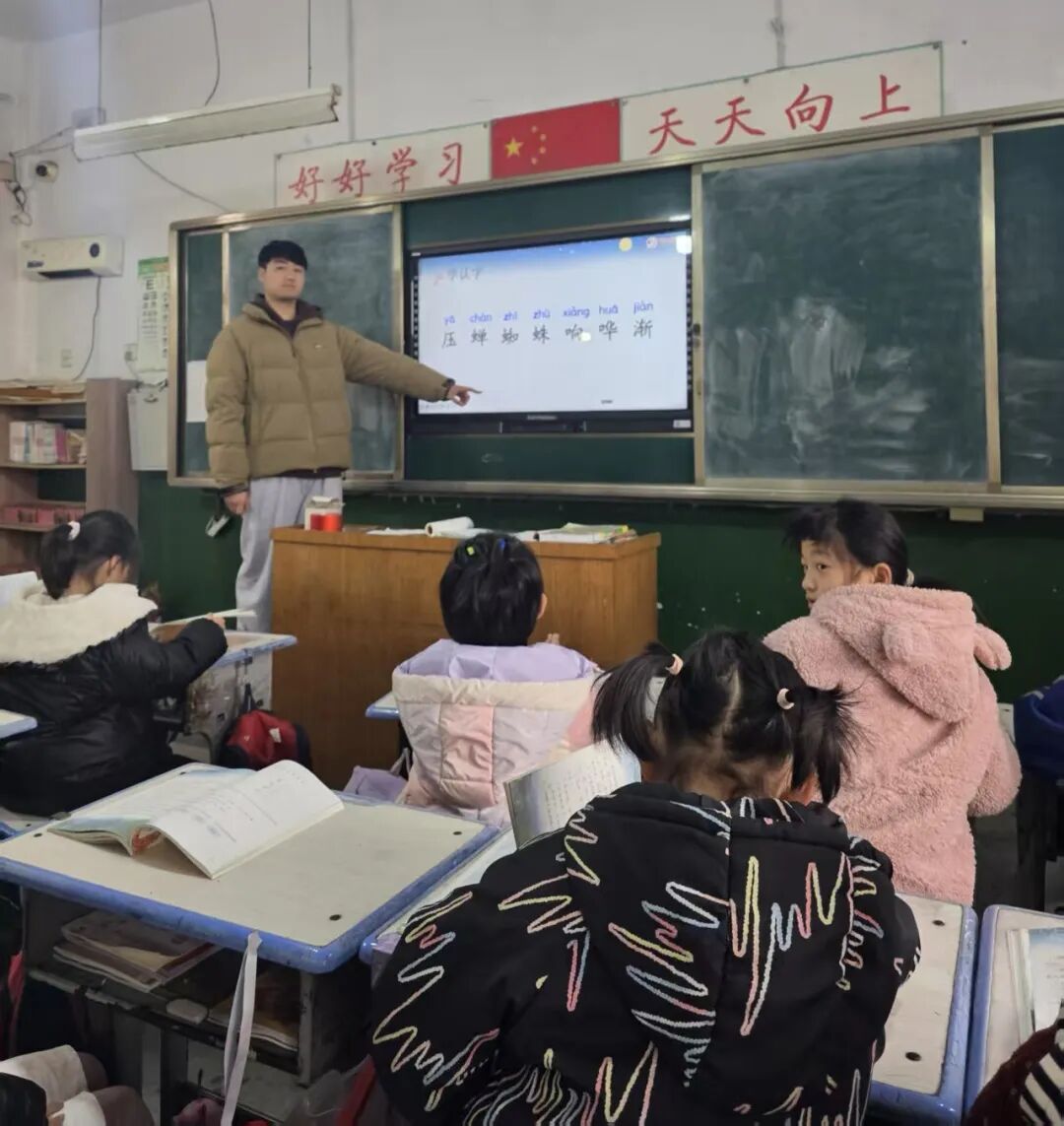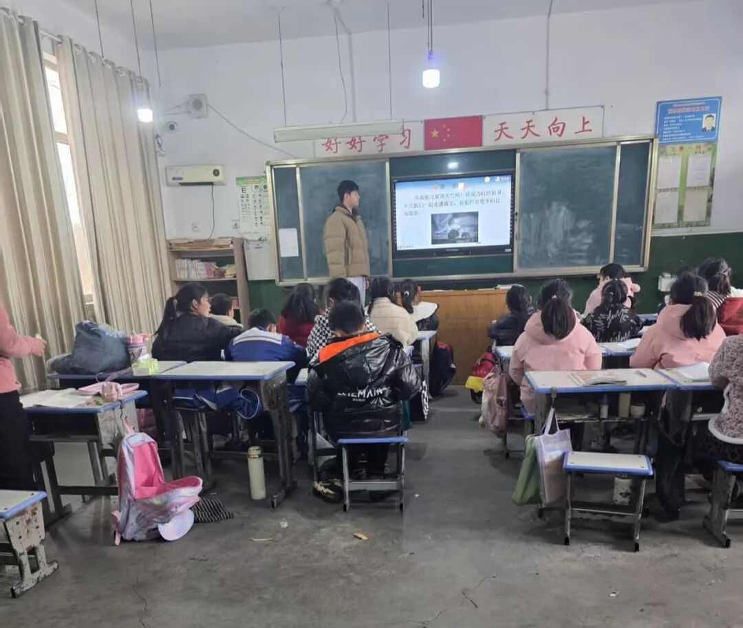 “老师”,我们班都可喜欢你上课!”在我上的每一节语文课上,这群学生都很积极地配合着课堂的节奏,也正是他们向上的正能量,给了我莫大的鼓励和支持,让我觉得在帮助孩子们的同时,自己也在被深深地温暖着。虽然我是英语专业的学生,但在这里承担起小学语文的教学任务,对我来说是一次奇妙的跨界与挑战。有一次,我给他们讲《古诗二首》,看着多媒体屏幕上的水墨画卷,听着讲台下传来的稚嫩但整齐的朗读声,我突然觉得那些古老的文字在这一刻有了生动的具象。办公室里的老师告诉我,班里平时最内向的一个孩子最近有了很大的进步。正是那个课间总是会跑到我的讲台旁,小声问我生字拼音的那个学生。当我无意中随口鼓励他一句“你的字写得很认真哦”,第二天他会跑来给我看自己抄写得整整齐齐的两页田字格,上面还标清楚了每一个拼音的声调。这种被需要和被信任的感觉,是支教生活给我最好的礼物。