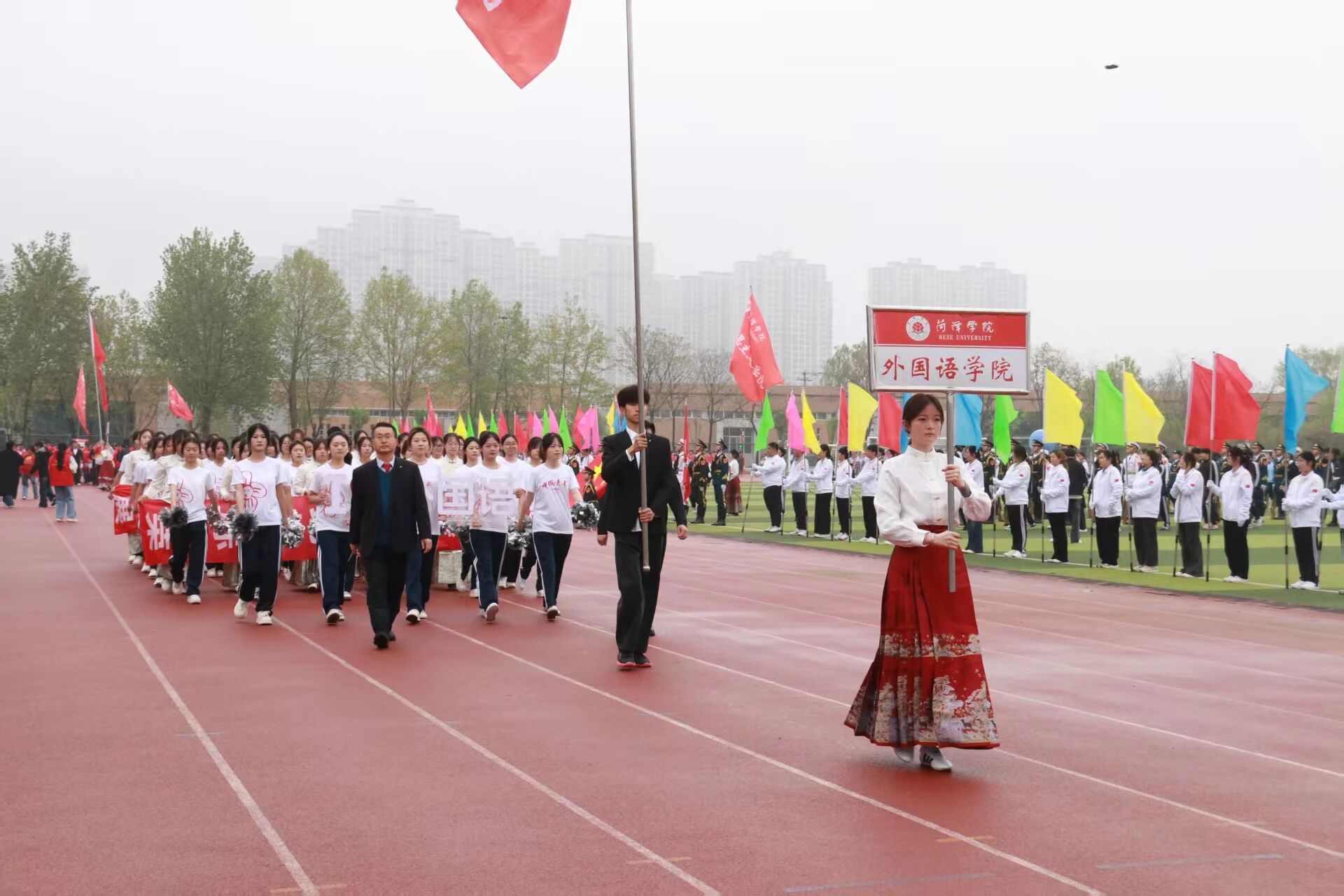 4月9日,菏泽学院2026年春季运动会正式拉开战幕,全天各项赛事正火热进行中,赛场之上高潮迭起、热力四射。外国语学院师生同心聚力、奋勇争先,以昂扬姿态驰骋赛场,用拼搏与汗水尽显青春朝气与团队风采。