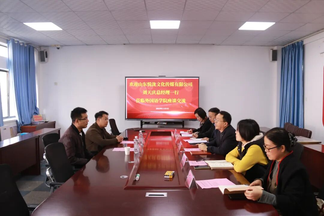为进一步深化产教融合、校企合作,提升人才培养质量,11月5日,山东悦泷文化传媒有限公司总经理刘天庆一行到访菏泽学院外国语学院。双方围绕人才培养、直播室建设等领域开展座谈交流,并举行校外实践教学基地授牌仪式。我院党委领导班子成员和商务英语系教师共同参加会议。