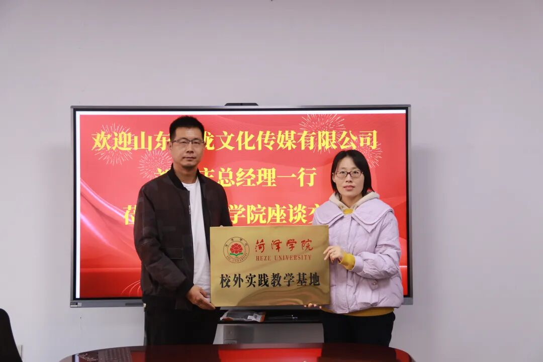 座谈结束后,双方举行了隆重的校外实践教学基地授牌仪式。党委委员、副院长刘静为山东悦泷文化传媒有限公司授予“菏泽学院校外实践教学基地”牌匾,这标志着双方在人才培养、实践教学等方面的合作迈出了实质性的一步。