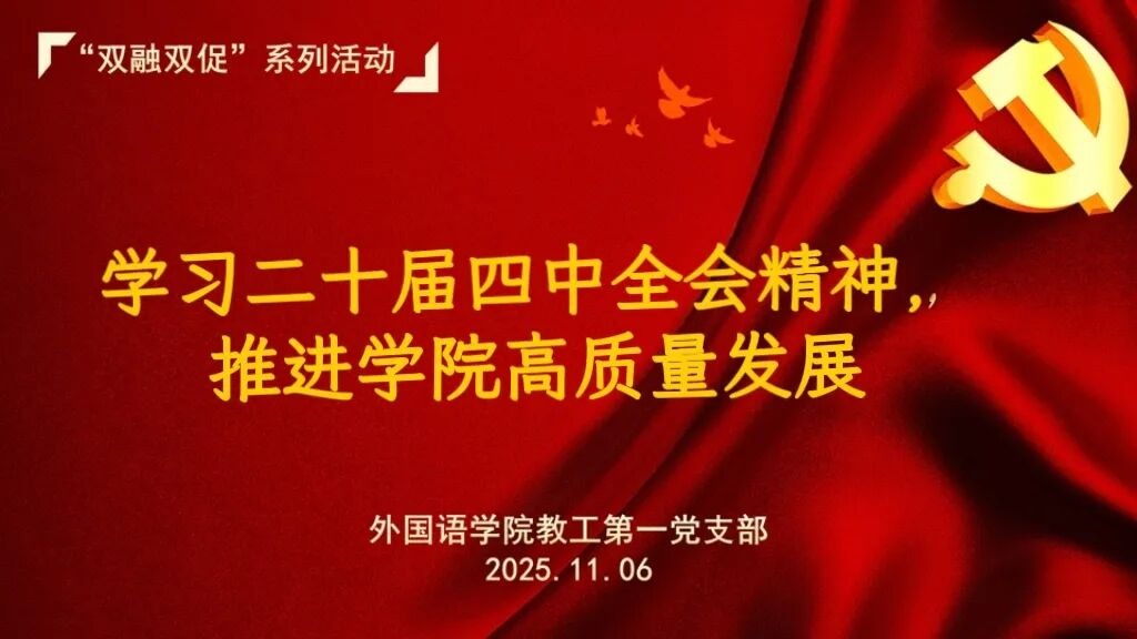 为深入推进党建工作与教学科研中心工作深度融合、相互促进,11月6日下午,外国语学院教工第一党支部通过线上平台成功召开“双融双促”系列专题学习会。会议集中学习了党的二十届四中全会精神,并围绕国家“十五五”规划展望中的关键目标展开深入研讨,旨在以高质量党建引领高质量事业发展,将最新政策精神转化为立德树人的生动实践和科研创新的强劲动力。