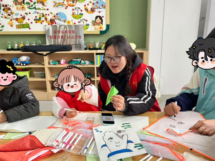 绘画与风筝创作环节中,志愿者们耐心陪伴在孩子们身边,手把手指导他们配色、勾勒图案,孩子们用画笔在纸上画出太阳、小花、小动物等充满童真的图案,在风筝上进行绘图绘画。