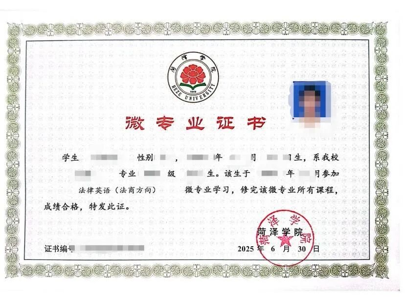 学生完成本微专业全部课程学习并通过考核,达到15学分要求后,由菏泽学院颁发“法律英语(法商方向)”微专业证书,证书信息纳入学校学籍管理系统,学信网可查询,作为学生跨领域就业、升学的重要能力证明。