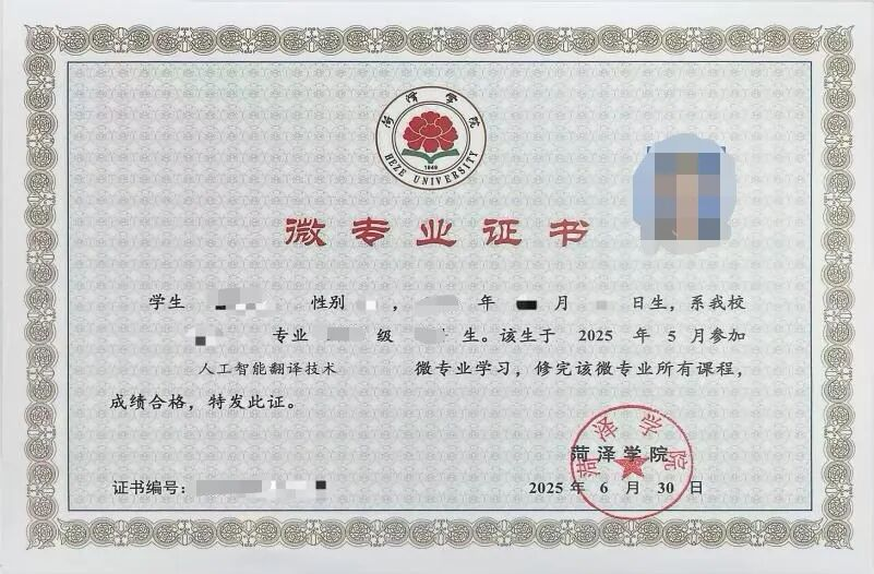 五、证书授予学生完成本微专业全部课程学习并通过考核,达到15学分要求后,由菏泽学院颁发“人工智能翻译技术”微专业证书,证书信息纳入学校学籍管理系统,学信网可查询,作为学生跨领域就业、升学的重要能力证明。