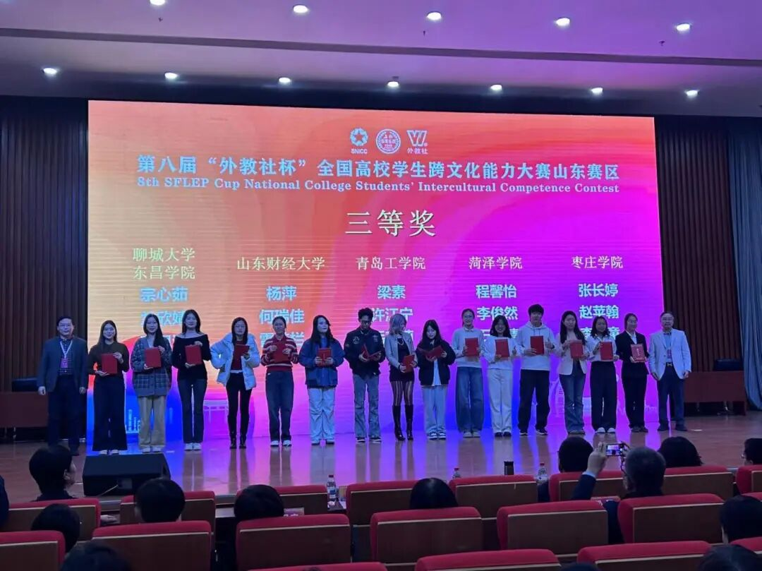 10月25-26日,第八届“外教社杯”全国高校学生跨文化能力大赛山东赛区决赛在山东师范大学长清校区隆重举行,60支高校队伍同台竞技,围绕“坚定文化自信,增进国际理解”的核心主题展开激烈角逐。经过案例展示、深度分析及讲述中华文化故事等多环节的层层考验,由外国语学院郑鲁燕、鲍莹两位老师指导,外国语学院程馨怡、人文与新闻传播学院石晴晴、政法学院李俊然三位学生组成的菏泽学院代表队荣获省级三等奖。