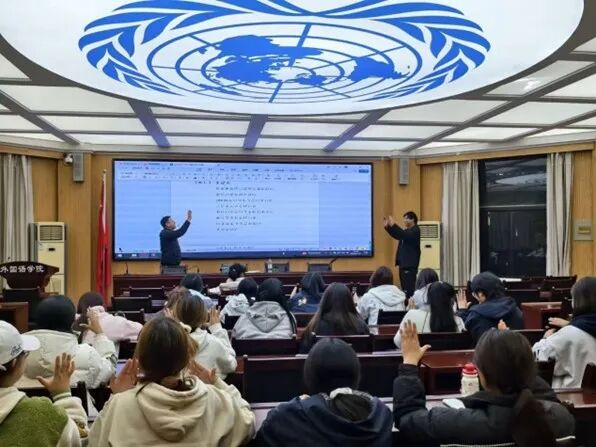 活动现场,外教以经典日语歌曲为素材,首先完整示范演唱,用清晰的发音和饱满的情感展现歌曲的韵律与意境,让同学们快速熟悉旋律基调。随后,外教带领大家逐句跟唱,针对歌词中的发音节奏,通过反复领唱、手势提示等方式引导同学们调整状态,确保整体演唱的协调性。过程中,外教不时邀请同学走上讲台,与她共同带领全场演唱,被邀请的同学积极配合,在师生的默契协作下,现场歌声愈发整齐嘹亮,氛围热烈而有序。