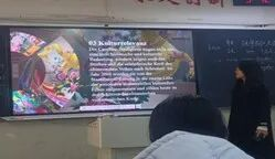 活动现场,三组同学带来了精心筹备的PPT与生动影像,次第展开家乡手工艺品的文化长卷。第一组同学聚焦曹州面人,从历史溯源、手工技法到民俗寓意层层递进,让面团在匠人手中“生花”的神奇,成为传统文化具象化的生动注脚;第二组同学深耕曹州绳编(俗称“牌子花活”),详解这门源自定陶的民间技艺:它脱胎于古老绳结艺术,明清时期盛极一时,以穿、挑、拧等精巧手法,将自然生灵凝于绳线之间,既藏着中国人对自然之美的体悟,更载着家乡手艺世代相传的坚守。分享结束后,老师补充了德语中“绳结艺术”(Knotenkunst)的文化应用场景,为表达增添了更丰富的维度;第三组同学则以中国刺绣为核心,系统梳理其千年演变脉络:从唐代前兼具实用与装饰的初心,到宋明时期“绣画”成型、明代洒线绣独树一帜的突破,再到清代宫廷御用刺绣的极致精巧与现代艺术家沈寿斩获国际大奖的辉煌,更细数苏绣的细腻典雅、湘绣的地域风骨、蜀绣的川蜀韵味、粤绣的百年传承,让这门融合绘画意境与手工温度的非遗艺术,在德语表达中绽放跨文化魅力。老师特别留意到同学们对“刺绣针法”(Sticktechnik)的诠释,在后续点评中肯定了表述的准确性,还分享了更贴合德语思维习惯的替代表达。