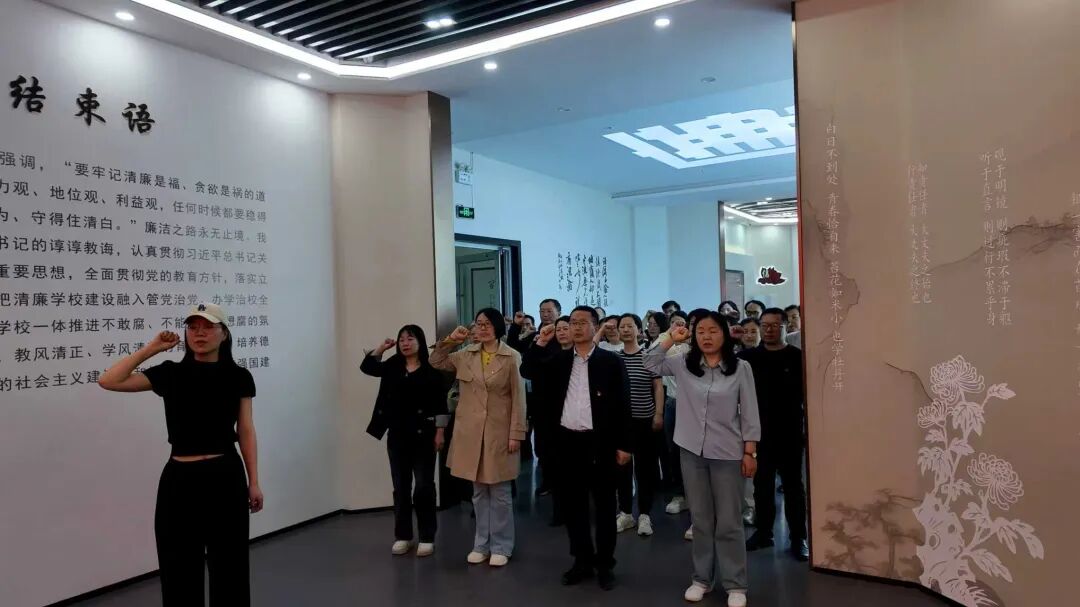 在廉洁文化教育馆宣誓区,全体党员面向鲜红党旗,高举右拳重温入党誓词。铿锵誓言回荡展厅,进一步强化了党员身份意识、宗旨意识与纪律规矩意识。