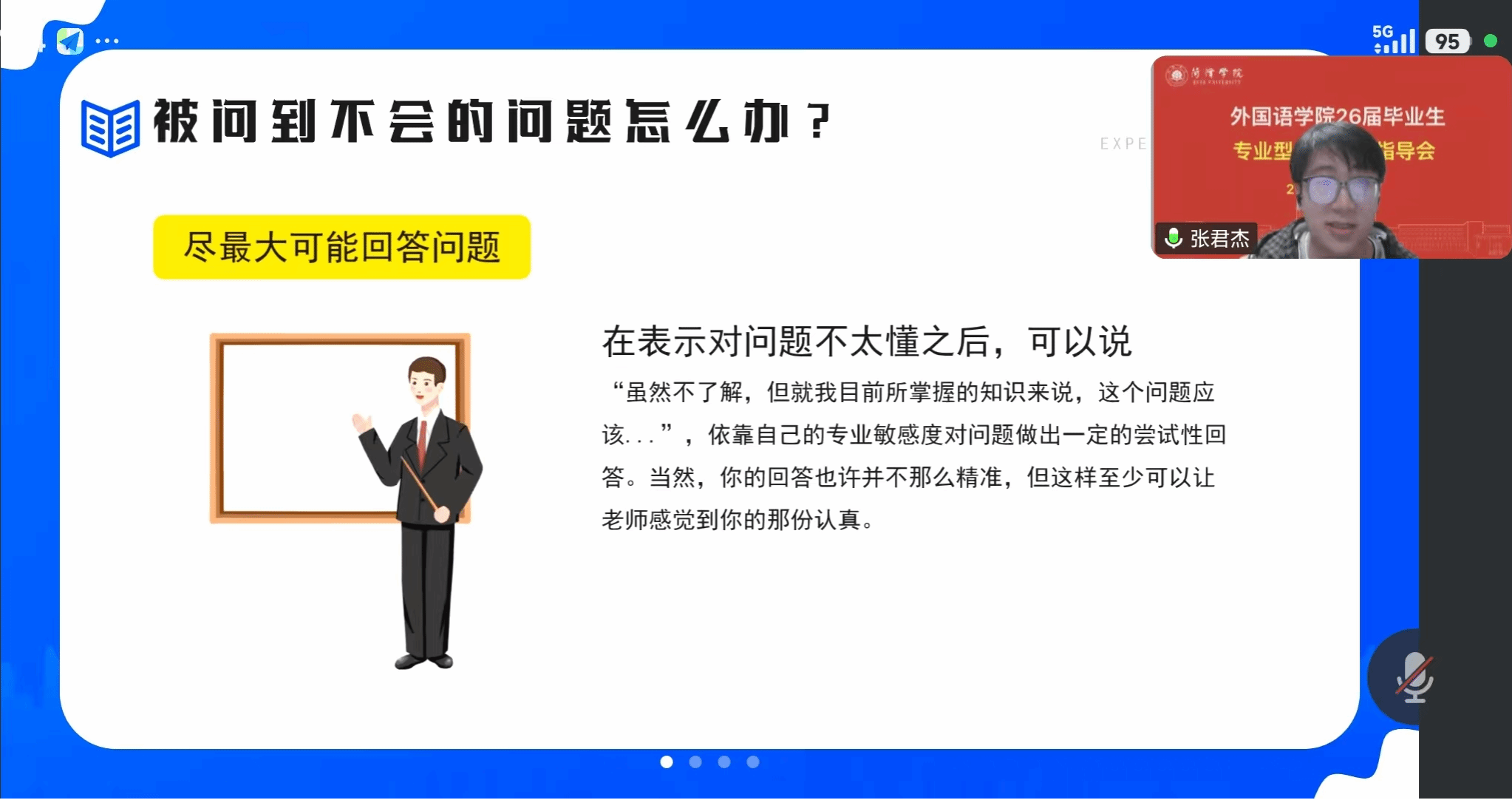 学院特别邀请了目前就读于东北师范大学、北京语言大学、四川外国语大学、天津外国语大学、曲阜师范大学等多所高校的25届毕业生组成专业指导团队,结合自身复试实战经验,为同学们带来干货满满的指导。学术型考研复试指导专场重点讲解了专业理论知识梳理、学术文献阅读、科研潜力展示等关键内容,结合研招复试改革中对科研创新潜质的侧重,分享了自我介绍、专业问答、科研设想阐述的技巧,提醒同学们关注学科前沿动态,夯实学术基础,展现自身的学术素养与研究潜力;专业型考研复试指导专场结合专业型硕士“重实践、强应用”的培养目标,详解了复试中的案例分析、专业技能展示、职业规划阐述等重点环节,分享了外语口笔译、学科教学等方向的复试经验,针对专业英语应用、实践案例应答等高频难点给出具体解决方案,帮助同学们精准把握专硕复试的考查重点;跨专业考研复试指导专场则精准破解跨考学子的备考痛点,从专业知识衔接、跨考优势挖掘、复试差异化准备等方面展开,建议跨考同学突出自身学科交叉优势,弥补专业基础短板,同时讲解了应对导师关于跨考动机、专业适配性等问题的应答思路,帮助跨考学子理清备考方向,增强应试信心。